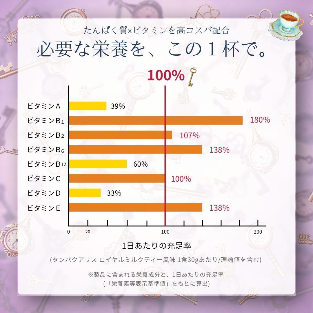 乳清たんぱく(乳成分を含む、アメリカ製造)、紅茶エキスパウダー(紅茶、デキストリン)、難消化性デキストリン/甘味料(ステビア、ラカンカ)、ビタミンC、抽出ビタミンE、乳化剤、香料、ビタミンA、ビタミンB1、ビタミンB12、ビタミンB6、ビタミンB2、ビタミンD