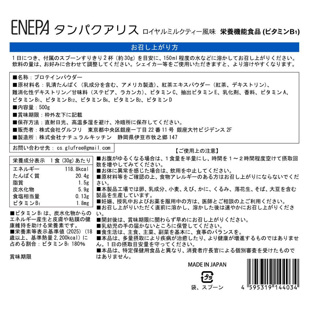 タンパクアリス 500g ロイヤルミルクティー風味 ホエイプロテイン ビタミンB1 カフェインレス ENEPA エネパ 人口甘味料不使用